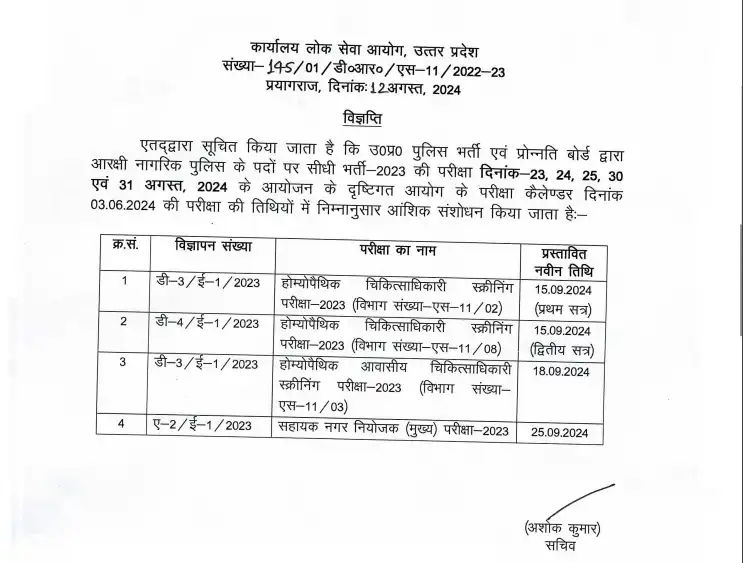 तीन जून के कैलेंडर में सहायक नगर नियोजक 2023 मुख्य परीक्षा 15 सितंबर को प्रस्तावित थी, जोकि अब 15 सितंबर को होम्योपैथिक चिकित्साधिकारी भर्ती परीक्षा होने के कारण सहायक नगर नियोजक 2023 मुख्य परीक्षा 25 सितंबर को कराई जाएगी। चिकित्साधिकारी यूनानी 2023 स्क्रीनिंग परीक्षा पूर्व निर्धारित तिथि छह अक्तूबर को होगी।